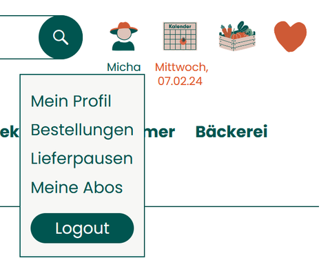 Nach der Anmeldung gelangst du über die Profilfigur zu deinem Kundenkonto mit verschiedenen Funktionen, wie Deinem Abo, der Möglichkeit Lieferpausen einzutragen, Deine favorisierten Artikel in einer Merkliste zu verwalten, Artikel die du nicht magst in einer Abwahlliste zu definieren oder deine letzen Bestellungen einzusehen.