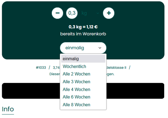 Du kannst bei jedem Artikel oder jeder Biokiste individuell wählen, ob du diese einmalig (für den ausgewählten Liefertag) oder für den von dir gewählten Lieferrhythmus erhalten möchtest. Hast du deine Bestellung abgeschickt, siehst du deine hinterlegten Abos im Profilbereich unter „Mein Abo“.