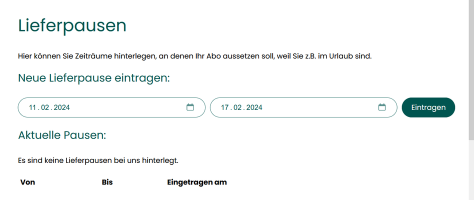 Wähle dann den gewünschten Zeitraum für die Lieferpause und klicke auf den Button "Eintragen". Die Lieferpause geht jetzt bei uns ein.