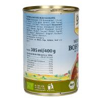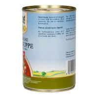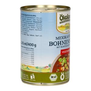 Trinkwasser, 11% Kidneybohnen*, 11% weiße Bohnen*, 8,2% grüne Bohnen*, 7,6% Paprika*, Zwiebeln*, 3,1% Mais*, Tomatenmark*, WEIZENMEHL*, Sonnenblumenöl*, Steinsalz, Maltodextrin*, Rohrohrzucker*, Meersalz, Karotten*, Maisstärke*, Gewürze* (Knoblauch*, Muskat*, Curcuma*, Pfeffer*, Paprika*, Chili*), Kräuter* (Liebstöckel*, Oregano*, Basilikum*, Rosmarin*, Thymian*, Petersilie*).| Energie | Fett | gesättigte Fettsäuren | Kohlenhydrate | Zucker | Ballaststoffe | Eiweiss | Salz |
