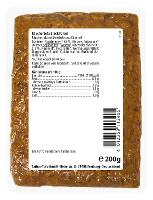 SOJABOHNEN* 61 %, Wasser, Sojasauce* (Wasser, SOJABOHNEN*, WEIZEN*, Meersalz), Zwiebeln* 2,2 %, Kümmel*, Petersilie*, Gerinnungsmittel: Magnesiumchlorid, Calciumsulfat; Buchenholzreiberauch.| Energie | Fett | gesättigte Fettsäuren | Kohlenhydrate | Zucker | Eiweiss | Salz |