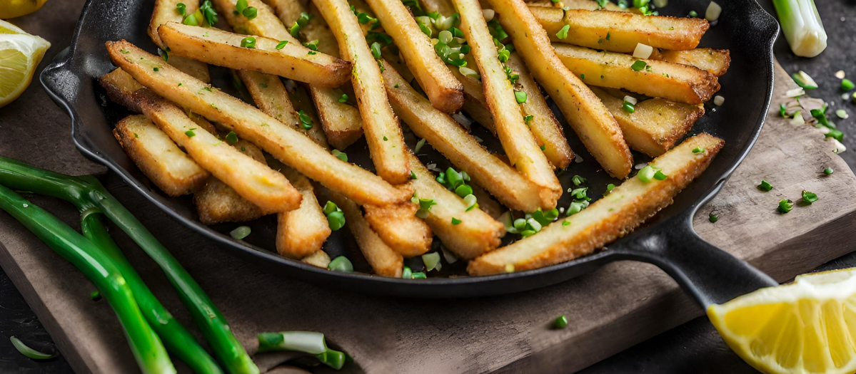 Kartoffeln schälen, waschen und in Stäbchen schneiden. Das Öl in einer großen Pfanne erhitzen und die Kartoffeln, bei mittlerer Hitze darin braten. Immer wieder wenden.