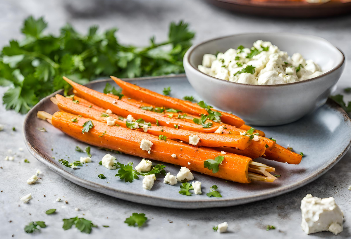 Die Möhrensticks auf einem Backblech verteilen und mit 3EL Olivenöl überträufeln. Salzen und pfeffern, dann für 25-30 Minuten in den Backofen.